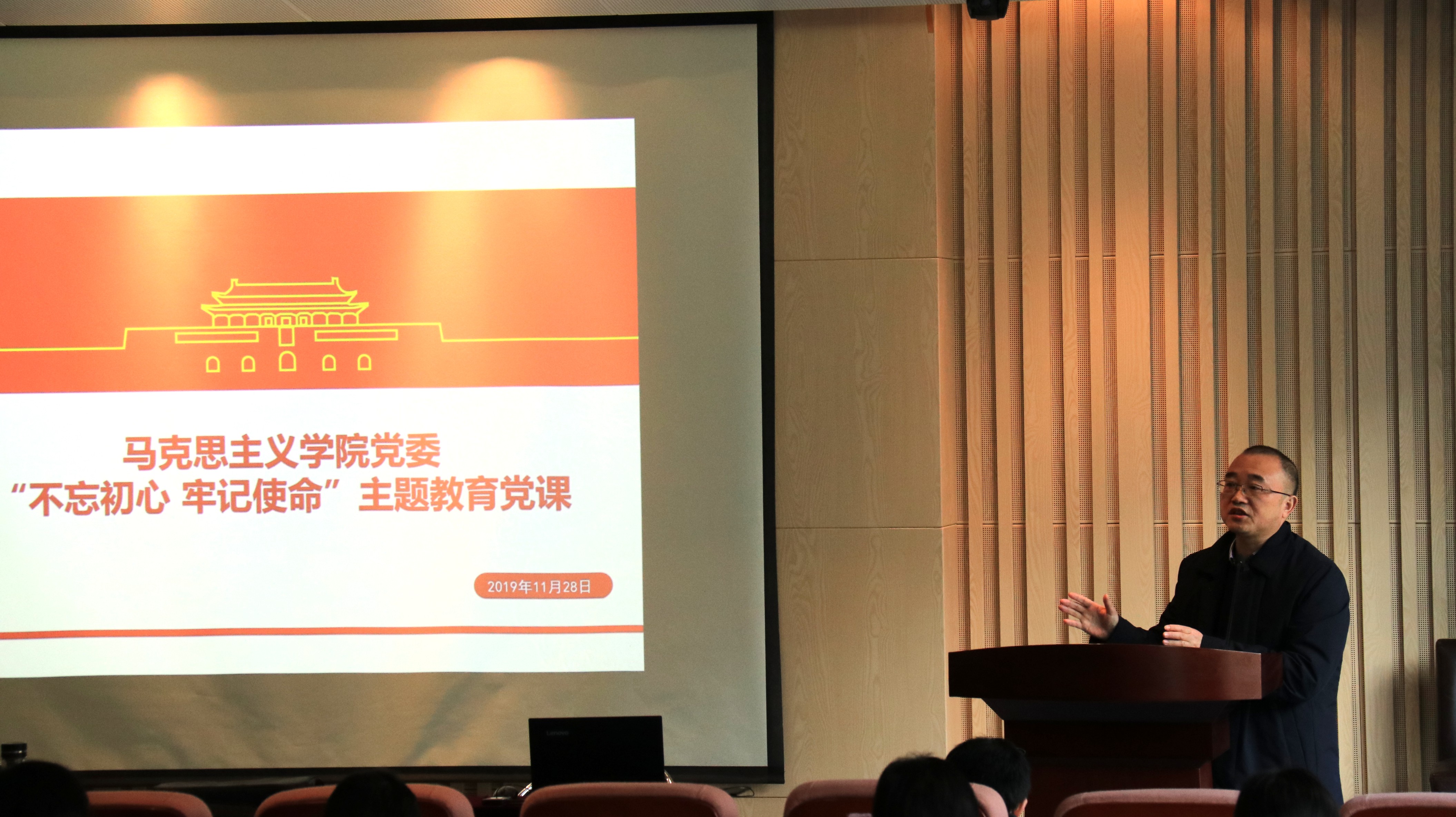 党委书记王建华、院长胡大平在圣达楼101报告厅为师生们讲授了一堂生动的专题党课。全体教职工党员、学生党员参加主题教育党课学习,教职工第一党支部书记张伟主持。