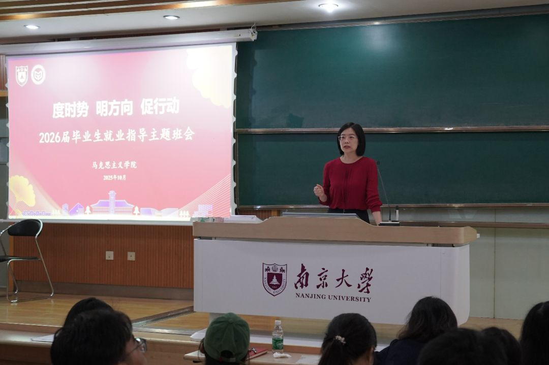 为进一步助力2026届毕业生从容应对就业挑战、把握发展趋势、调适就业心态、明晰职业方向,马克思主义学院于2025年10月11日举办了以“度时势 明方向 促行动”为主题的就业指导主题班会。本次班会由学院党委副书记夏娟老师、研究生辅导员刘晶月老师共同主讲,学院党委书记时昱老师莅临指导,2026届全体本硕博毕业生积极参与。