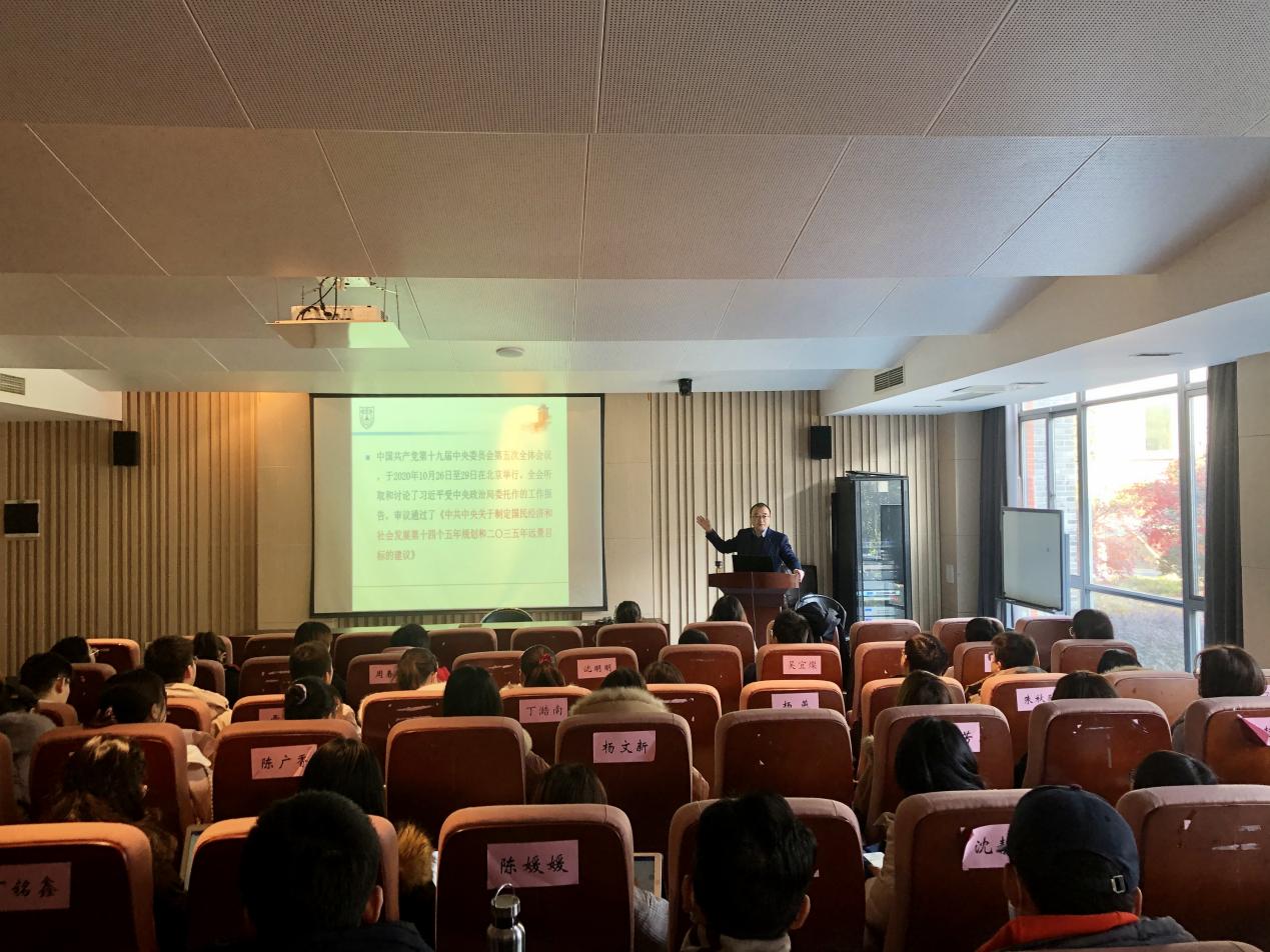 党委书记王建华教授在圣达楼101报告厅为学院全体党员学生进行了党的十九届五中全会精神解读,党委副书记时昱主持会议。