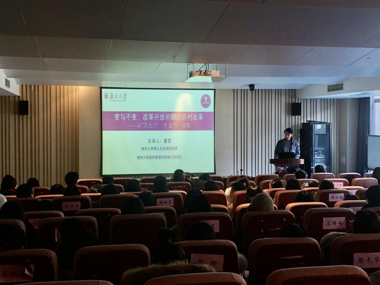 博士生讲师团讲师、政府管理学院博士研究生董昊首先为大家带来了题为《变与不变:改革开放初期的农村改革》的宣讲。他从“万元户”这个角度出发,从“万元户”的产生轨迹、农村经济的商品化及城乡关系、农村基层党组织的新动向、新时期的“旧传统”等方面娓娓道来,从历史脉络的梳理中为大家呈现出了波澜壮阔的改革开放史。最后,他总结指出农村改革是一个全局的过程,基层的自发改革实践和官方政策的变动改良是一个良性的互动过程。