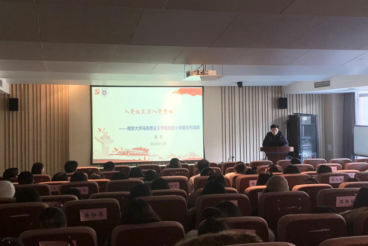 研究生第二党支部党员陈霄以《入党仪式与入党誓词》为题展开宣讲,带领大家回溯了入党仪式和入党誓词的来源和演变,生动讲述了其背后发生的故事,他指出,《共产主义者同盟章程》的誓词是中国共产党入党誓词产生和演变的历史源起,实践起点则是土地革命时期井冈山的实践。他以2017年10月31日习近平总书记带领中央政治局常委重温入党誓词为切入点,指出重温入党誓词是新时代我们共产党人增强党性、坚定理想信念的有效形式。