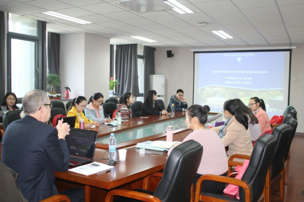 3月14日,18:30戴维斯教授就“公民教育和品格教育的关键问题”与大家展开讨论。教授向同学们阐释了“公民”概念的含义,政治教化、政治社会化、政治教育的关系和区别,并向同学们介绍了英国公民教育的背景和环境。教授详细介绍了公民教育的核心概念、内容、过程以及教育方法。教授举了两个生动的例子与同学们进行互动。讲座于21:10结束。
