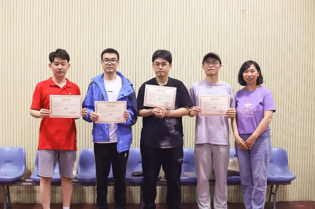 首先进行的男子单打对决便紧张激烈、扣人心弦、“好球”不断。削球、扣球、旋球、弧线球,挥拍落拍间尽显对力量、节奏和落点的透彻掌控。所有选手沉着应战、奋力拼搏,大家献上了一场场视觉的盛宴:有武海宝老师和崔舒畅同学高潮起伏的强强对决,彼此你来我往、见招拆招;也有崔晋同学以精准发球、娴熟接球、迅猛扣球连赢数轮,用完美的防守和绝杀点燃赛场,都将国球的魅力展现得淋漓尽致。最终,崔晋同学斩获本场比赛冠军,武海宝老师和贾一帆同学并列男单亚军,张显玉同学获得了比赛季军。