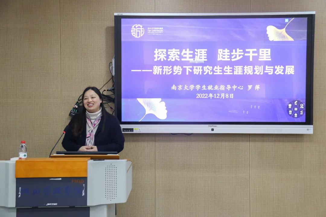 2022年12月8日下午2:00,南京大学马克思主义学院“师语撷珍 以心育新”系列讲座第七期在仙林校区圣达楼100B教室成功举办。本期讲座由南京大学就业指导中心副主任罗萍老师主讲,学院团委书记、辅导员刘晶月老师主持。罗萍老师以“新形势下研究生生涯规划与发展”为主题,为研一同学提供当今时代下的就业形势分析和生涯规划指导,帮助同学们找准自身定位、促进潜能激发。
