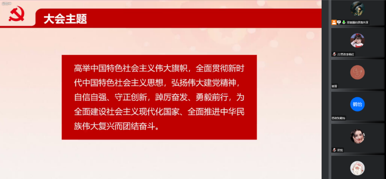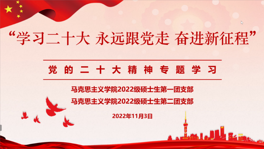 为深入学习贯彻党的二十大精神,弘扬伟大建党精神,激发广大团员青年自信自强、守正创新,踔厉奋发、勇毅前行,2022年11月3日,马克思主义学院2022级硕士生第一团支部、2022级硕士生第二团支部开展“学习二十大 永远跟党走 奋进新征程”党的二十大精神专题学习活动。本次活动采用线上形式,由2022级硕士生第一团支部书记邵嘉曌主持,南京大学博士生讲师团张润泽作为特邀嘉宾进行主题宣讲。