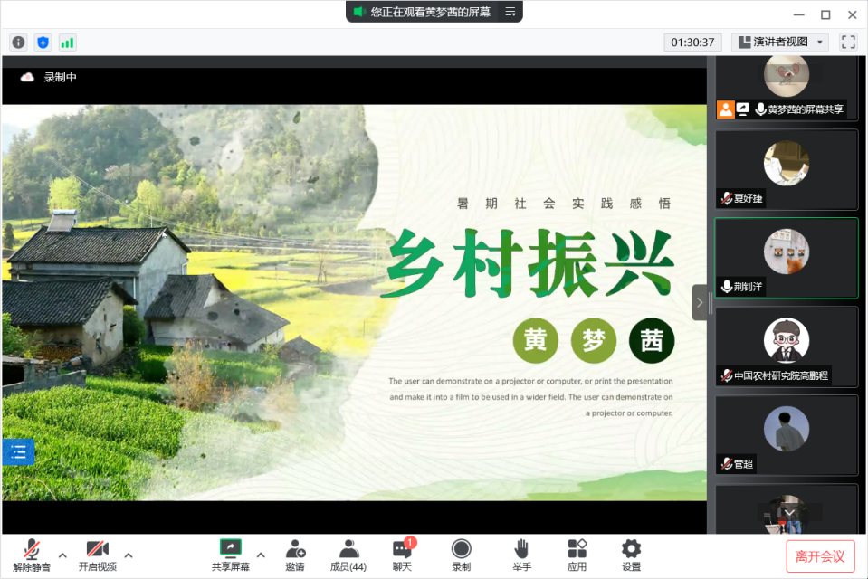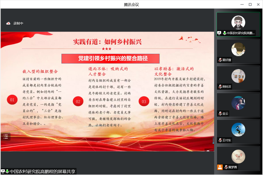 习近平总书记曾指出“广大团员青年自觉担当重任,深入基层一线,让青春在实现中华民族伟大复兴的中国梦中绽放异彩,为党和国家事业取得历史性成就、发生历史性变革贡献了青春、建立了重要功勋!”为深入学习习近平总书记关于青年工作重要指示精神,引领青年党员把人生理想融入国家和民族的事业中,积极投身乡村振兴伟大实践,在基层一线建功立业,2022年8月22日晚,马克思主义学院2021级硕士生第二党支部与安徽省民政厅养老服务处、中国农村调查中心(CRRC)联合开展“扬实践风采,展青年担当——2021级硕士研究生第二党支部暑期主题党日活动第3期‘乡村振兴’实践风采展示。”会议由2021级硕士生第二党支部成员荆钊洋同志主持。