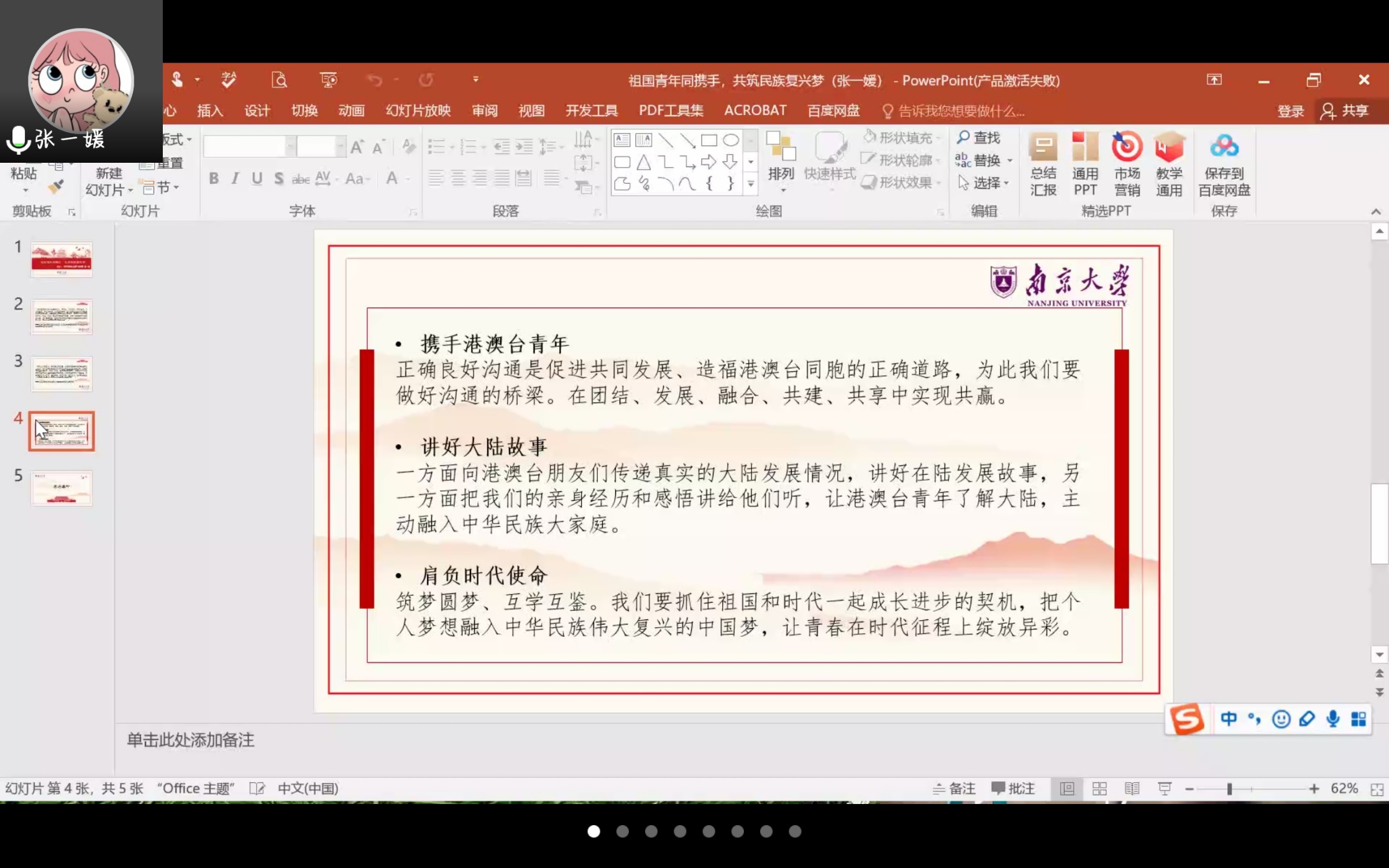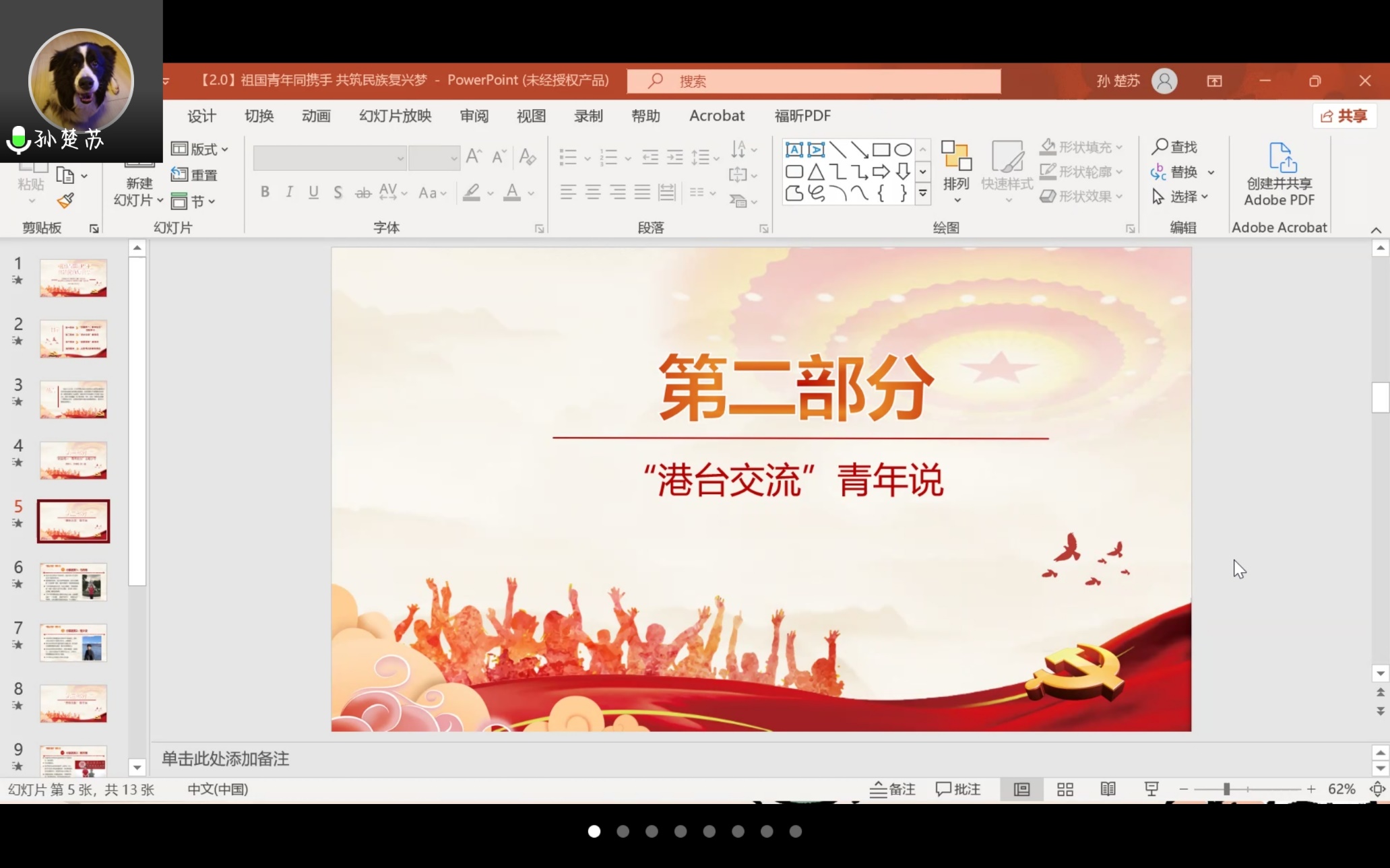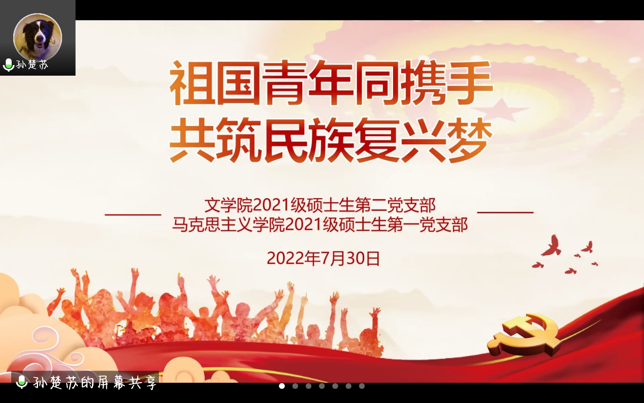为深入学习贯彻习近平总书记在庆祝香港回归祖国25周年大会讲话以及7月11日给参加海峡青年论坛的台湾青年的回信精神,响应“到西部去,到基层去,到祖国最需要的地方去”的时代号召,我院2021级硕士生第一党支部联合文学院2021级硕士生第二党支部于2022年7月30日晚七点共同开展“祖国青年同携手,共筑民族复兴梦”主题党日活动。通过讲述青年奋斗故事,展现青年理想担当,激励青年扎根祖国大地,为实现民族复兴梦而不懈奋斗。本次党日活动由我院2021级硕士生第一党支部成员孙楚苏主持,两支部全体党员、入党申请人共同参加。
