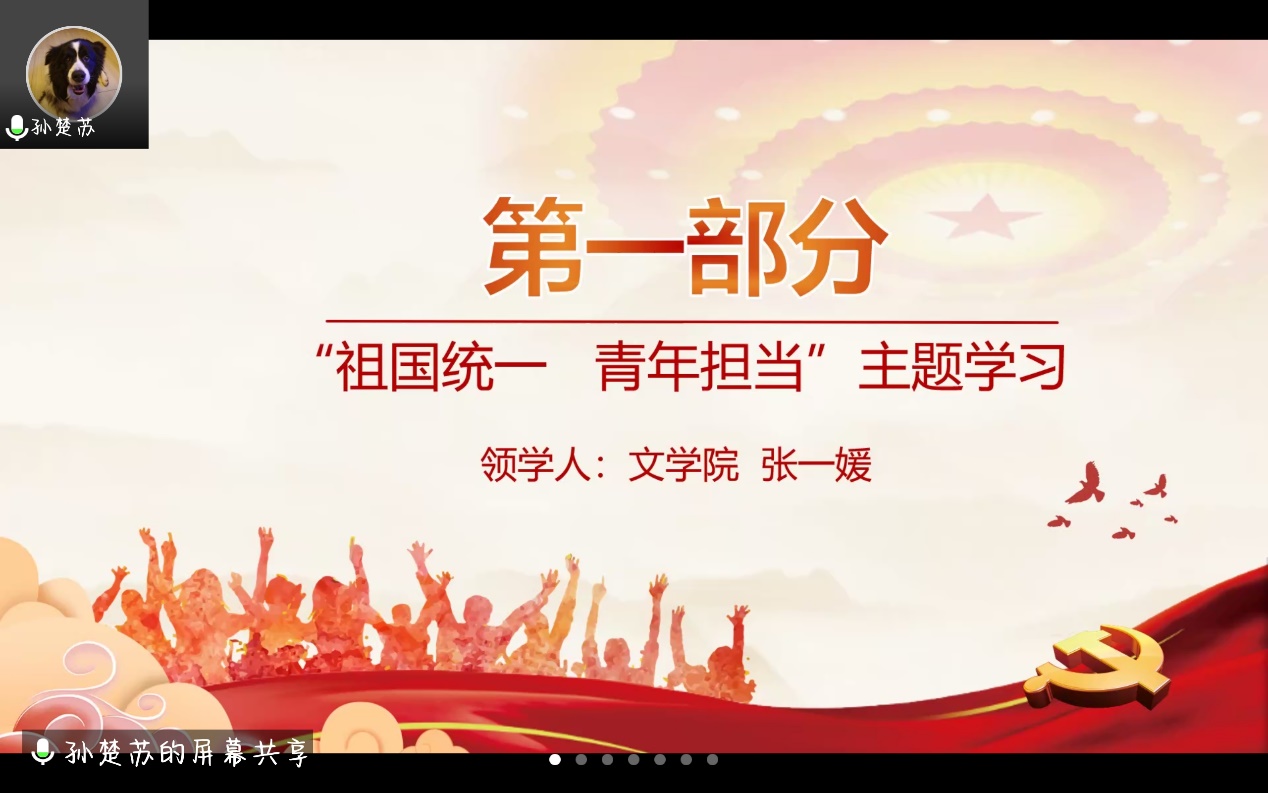 活动伊始,我院2021级硕士生第一党支部成员孙楚苏同志介绍了活动的整体流程,文学院2021级硕士生第二党支部书记张一媛同学为带领同学们进行“祖国统一,青年担当”主题学习。张一媛同学通过短视频与大家一同回顾了习近平总书记的香港之行,并重温习总书记在庆祝香港回归祖国25周年大会的讲话以及7月11日给参加海峡青年论坛的台湾青年的回信精神,她提出三点倡议:一是携手港澳台青年,做好沟通的桥梁;二是讲好大陆故事,让港澳台青年了解大陆,主动融入中华民族大家庭;三是肩负时代使命,与港澳台青年筑梦圆梦、互学互鉴,把个人梦想融入中华民族伟大复兴的中国梦,让青春在时代征程上绽放异彩。