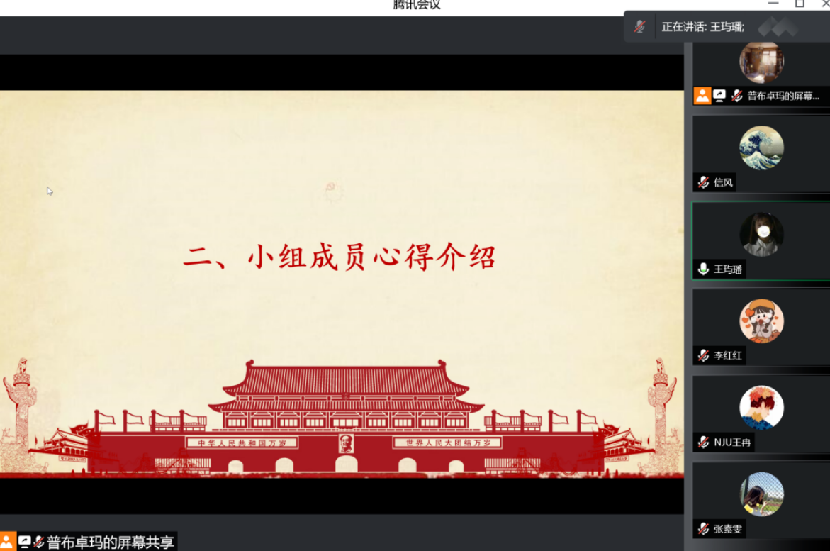 随后,各党小组成员深入交流了自己对于两会精神的所想所思。王玙璠同志从内蒙古自治区的发展实践出发,指出虽然内蒙古位居北疆边陲,地缘发展优势并不突出,但由于内蒙古人民的守望相助和团结奋斗,在脱贫攻坚、特色产业等各方面都取得了巨大成就,这表明团结奋斗是中国人民创造历史伟业的必由之路。王聪同志认为,正是源于习近平新时代中国特色社会主义思想的科学指引,才能妥善应对过去一年复杂严峻的国内外形势和诸多风险挑战,相信在以习近平同志为核心的党中央坚强领导下,一定能够圆满实现全年的主要目标任务,推动社会主义现代化建设取得新成就。韩建汶同志则分享了自己对于两会精神中“分类建设一流大学和一流学科,加快优化学科专业结构”的理解,并表达了对建设“第一个南大”的憧憬和期待。