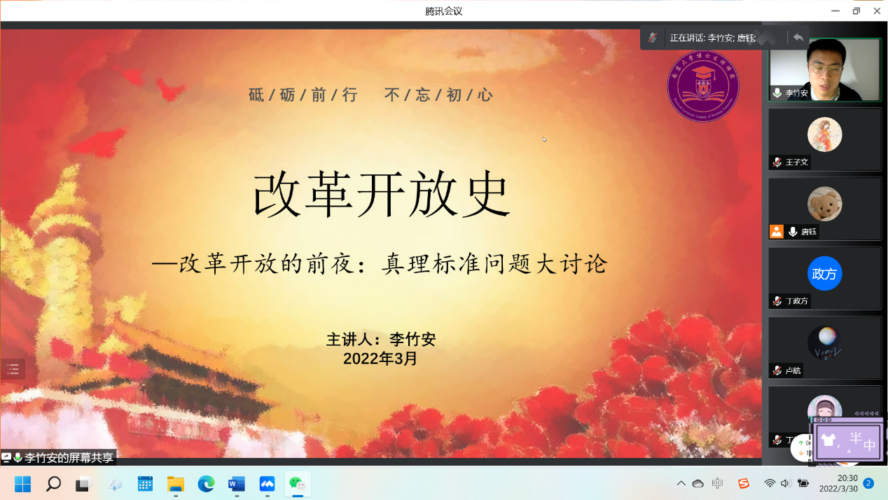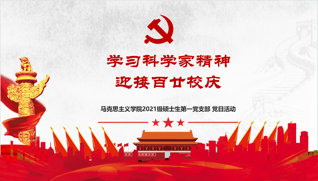 弘扬科学家精神,奋进强国新征程。2022年3月30日,为迎接党的二十大召开,在南京大学建校120周年校庆之际,马克思主义学院21级硕士研究生第一党支部邀请博士生讲师团讲师李竹安共同开设“党史校史小课堂”,学习科学家精神,迎接百廿校庆,跟随南京大学胡福明教授的脚步,围绕“关于真理标准问题大讨论”开展线上党日活动,活动由马克思主义学院2021级硕士生第一党支部书记唐钰同志主持。活动主要分为四个环节,分别为博士生讲师团党课宣讲、第一党小组组织学习、各党小组学习讨论和视频展示。