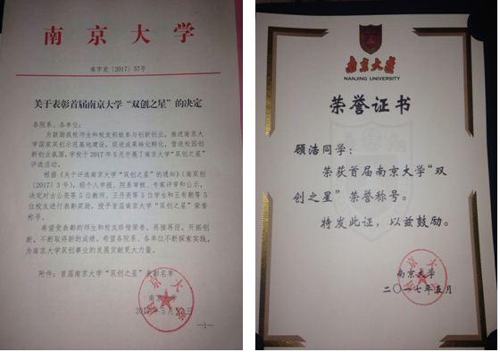 5月31日,首届南京大学“双创之星”颁奖仪式在南京大学仙林校区隆重举行。我院15级硕士研究生顾浩荣获首届南京大学“双创之星”荣誉称号。