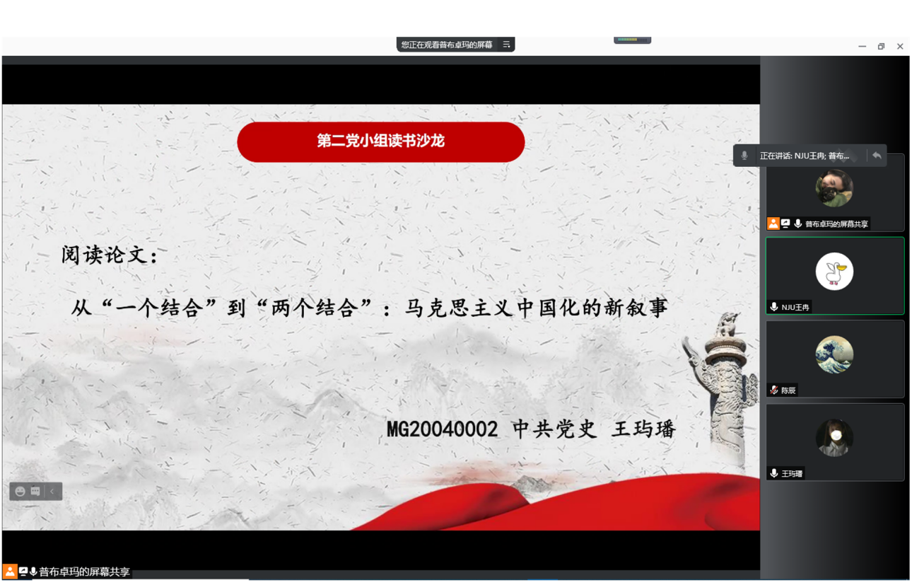 为深入学习贯彻习近平总书记 “七一”重要讲话精神,深刻领会党团结带领人民不懈奋斗的光辉历程和伟大成就,从党的百年奋斗史中汲取前进的智慧和力量,我院2020级研究生第二党支部于9月27日开展党史理论学习专题活动。