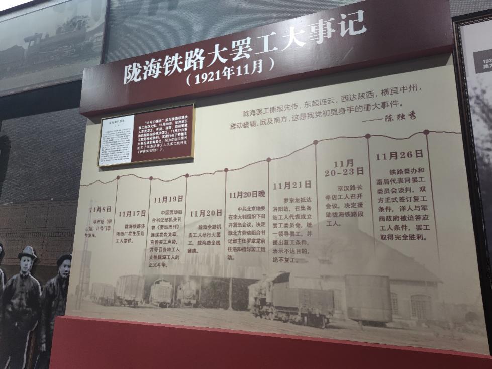 第一部分的主题是:“建立党的组织、为新民主主义革命胜利作出重要贡献”。当参观到“陇海铁路大罢工事记”板块时,熊秋良老师介绍道:“1921年11月,陇海铁路工人在中国共产党的影响和领导下,为‘反虐待’‘争人格’‘光国体’,举行了轰轰烈烈的首次全路大罢工。这次罢工斗争,不仅推动了北方工人运动的发展,而且也标志着党领导的第一次全国工人运动高潮的到来,是一次具有重要意义和深远影响的工人运动。”在“常州三杰”的展板前,倪春纳老师向大家介绍道:“瞿秋白、张太雷、恽代英这3位常州籍青年,为了心中信仰选择了共产主义事业,作为中国革命早期领导人,为中国革命的成功打下了坚实的基础,被后人称为‘常州三杰’。”