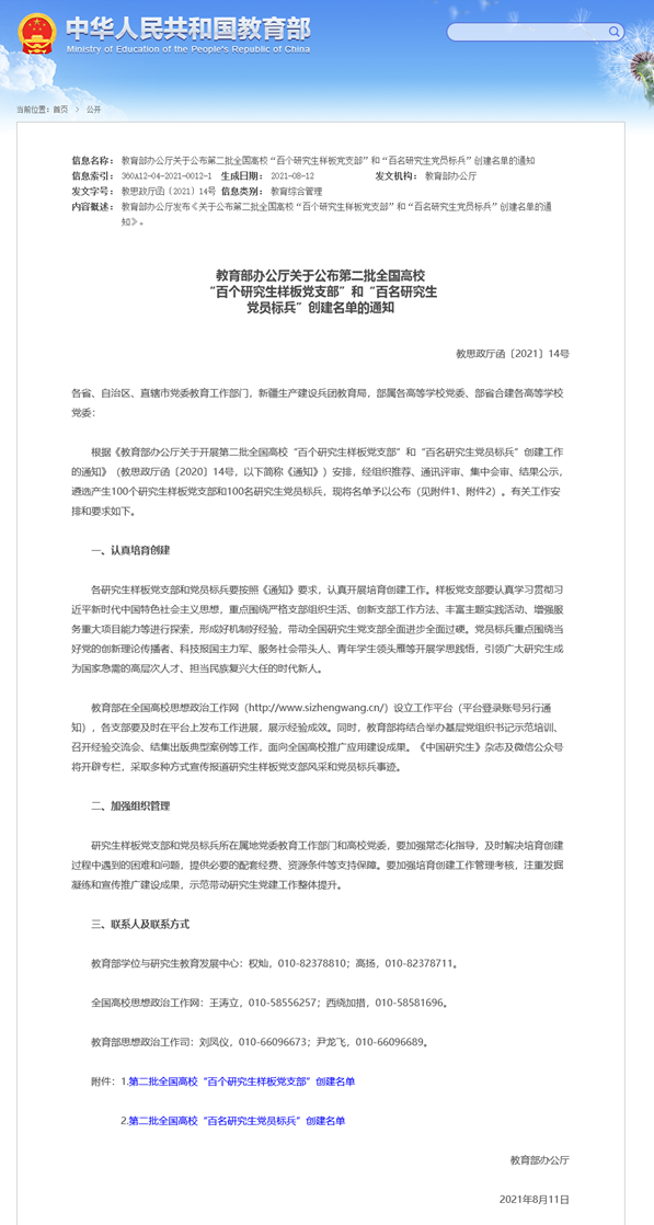 近日,教育部第二批全国高校“百个研究生样板党支部”和“百名研究生党员标兵”创建工作评审结果揭晓,我院研究生第二党支部入选第二批全国高校“百个研究生样板党支部”。