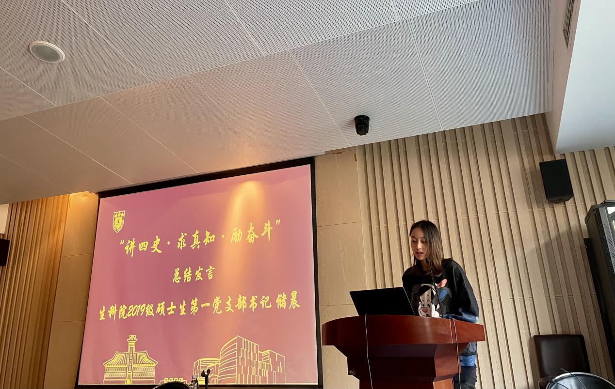 活动最后,生命科学学院2019级硕士生第一党支部书记储晨做总结发言。她提出,学习四史也许是困难的,但确是必要的。我们总是知当下而不知过往,知其然而不知其所以然,直接不加区分地接收“四史”的理论不是我们的目标所在,我们应在其中以史为鉴,学以致用,将所学融入学习、工作和生活,真正做到知史爱党、知史爱国。