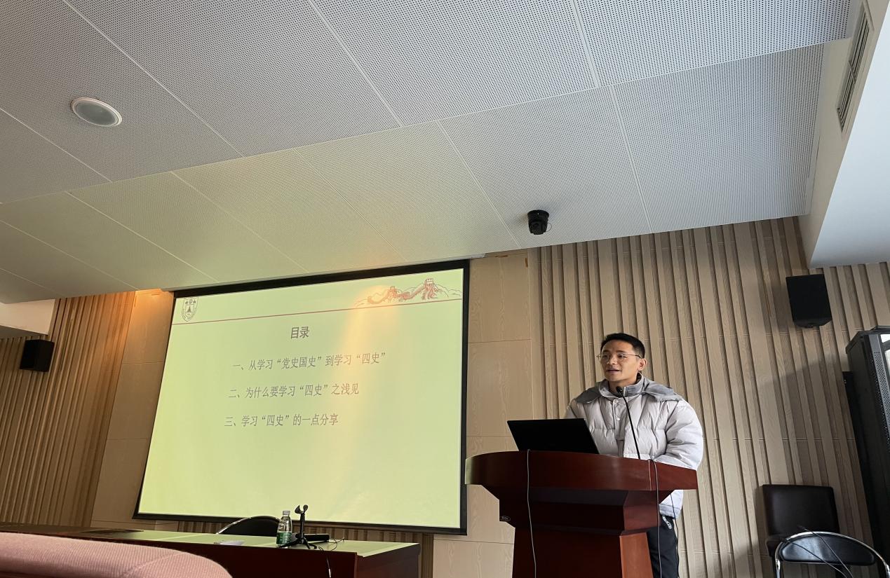 研究生第二党支部党员夏黎明做题为《讲“四史”·求真知·励奋斗》的宣讲。他从学习“四史”的发展演进、学习“四史”的原因以及自己在学习“四史”中的心得体会三个方面出发进行了分享。结合时事热点,他生动解读了学习“四史”的重要性及在其中体会到的“观世、斗争、等待”的宝贵经验。