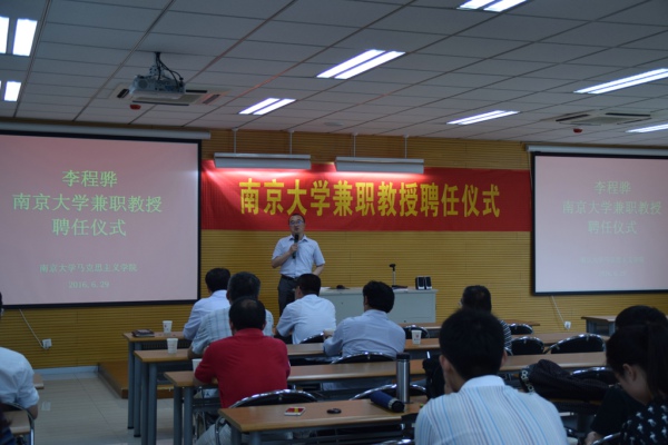 院长王明生授予李程骅教授兼职教授聘任书并佩戴南大校徽。