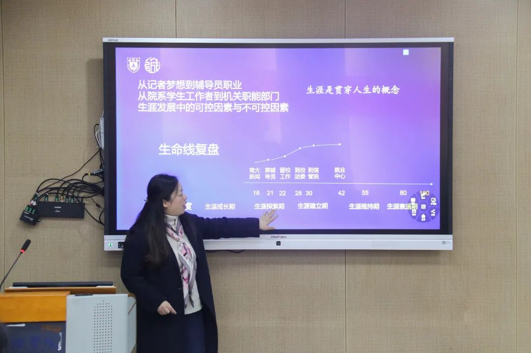 2022年12月8日下午2:00,南京大学马克思主义学院“师语撷珍 以心育新”系列讲座第七期在仙林校区圣达楼100B教室成功举办。本期讲座由南京大学就业指导中心副主任罗萍老师主讲,学院团委书记、辅导员刘晶月老师主持。罗萍老师以“新形势下研究生生涯规划与发展”为主题,为研一同学提供当今时代下的就业形势分析和生涯规划指导,帮助同学们找准自身定位、促进潜能激发。
