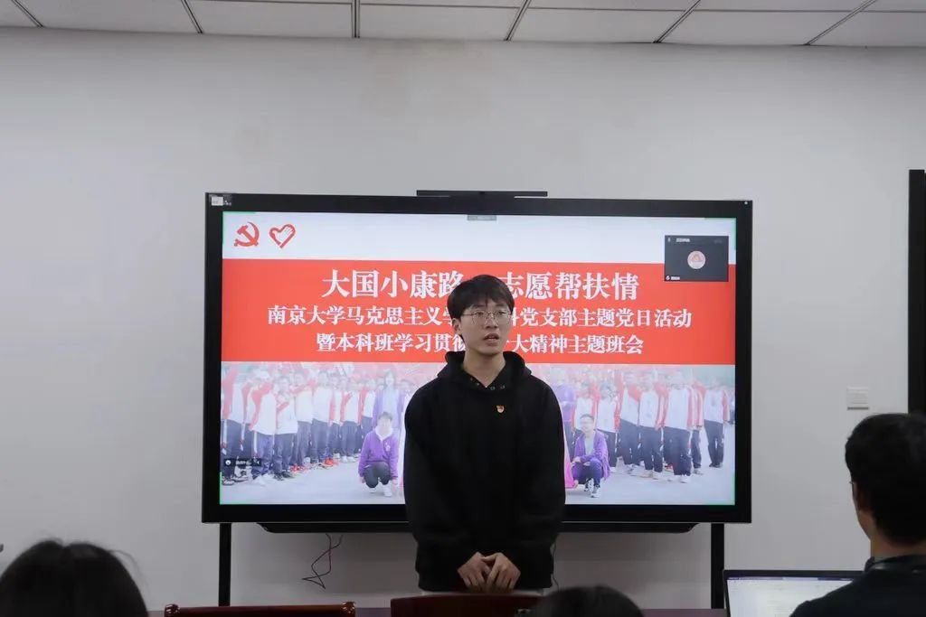 活动的最后,本科生党支部宣传委员史善聪对本次主题活动进行总结。他对王泽森和贾姣妹同志的发言内容进行了总结,并为大家分享了南京大学校友袁辉老师的支教故事,袁辉校友十年如一日在祖国的大山深处支教,无怨无悔,将青春奉献给教育事业,让梦想的力量感染每一个大山深处的孩子。随后,他号召同学们向几位前辈同志学习,提升自己的精神境界,锻造自身修养,做一个纯粹的人、摆脱低级趣味的人、为人民服务的人,去基层建功、到一线立业,在时代的潮头前展现南大智慧和南大担当,让青春之花绽放在祖国需要的地方。