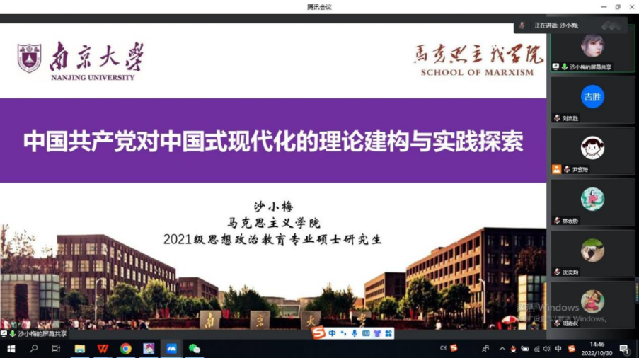 2022年10月22日,举世瞩目的中国共产党第二十次全国代表大会在北京人民大会堂胜利闭幕。为深入学习二十大报告精神,提升支部党员的思想理论修养,更好地发挥共产党员先锋模范作用,10月30日下午,我院硕士生第二党支部开展“再踏层峰辟新代,更扬云帆立潮头——二十大精神集体学习”线上主题党日活动。本次活动由硕士生第二党支部书记尹紫琦主持,南京大学马克思主义学院青年宣讲团讲师沙小梅作为特邀嘉宾进行主题宣讲。
