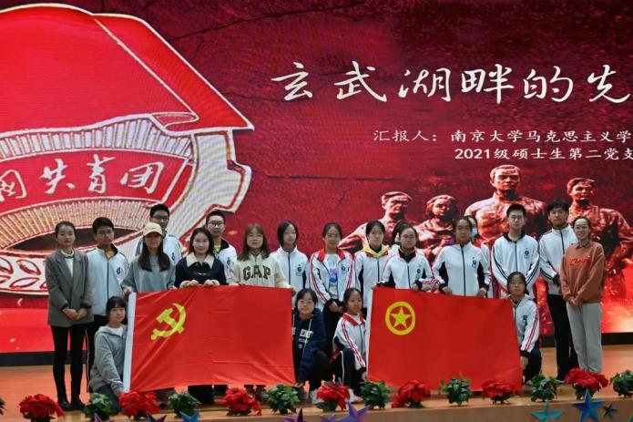 为认真贯彻落实习近平总书记关于抓好青少年学习教育,让红色基因、革命薪火代代传承的重要指示精神,培育广大青少年学生在心中厚植爱党、爱国、爱社会主义的情感,2022年10月10日上午,马克思主义学院2021级硕士生第二党支部与南京市第十三中学联合开展“喜迎二十大,奋进新征程”系列党日活动第1期:教育专题——党史宣讲进校园。支部成员张沁园同志作“玄武湖畔的先声”主题宣讲,十三中全体师生与我院2021级硕士生第二党支部部分成员参加本次活动。