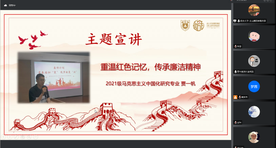 “青年者,国家之魂。”青年崇廉尚洁、严以律己,国家就能正气充盈、永葆青春活力。习近平总书记在庆祝中国共产主义青年团成立 100 周年大会上指出,要涵养廉洁自律的道德修为,心有所畏、言有所戒、行有所止,不断锤炼意志力、坚忍力、自制力,做一个一心为公、一身正气、一尘不染的人。为深入学习习近平总书记关于廉洁廉政工作重要指示精神,引领新时代中国青年扣好廉洁自律的“第一扣”、系好廉洁自律的“安全带”,2022年8月29日晚,马克思主义学院2021级硕士生第二党支部与南京市鼓楼区纪委监委、南京大学青年廉洁社联合开展“扬实践风采,展青年担当——2021级硕士研究生第二党支部暑期主题党日活动第4期‘廉洁廉政’实践风采展示。”会议由2021级硕士生第二党支部成员王云鹏同志主持。