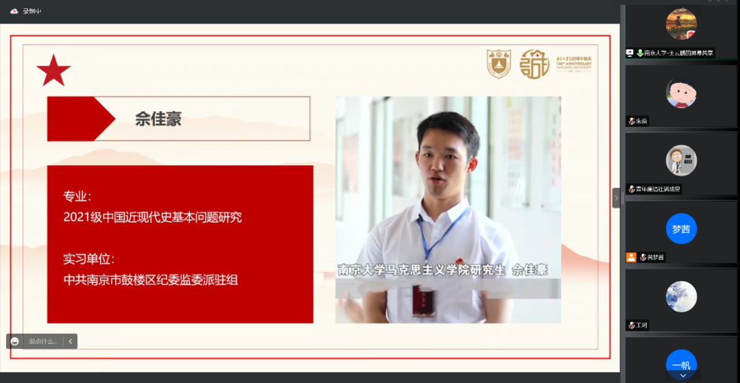 第三个环节,由南京大学马克思主义学院2021级硕士生第二党团支部党员进行暑期社会实践第4期汇报展示。本次汇报的党员是第五组的三位同志,他们利用假期时间,在不同的政务工作岗位上认真锻炼,在不同的地方基层上积极调研,彰显出南大学子的青年担当。