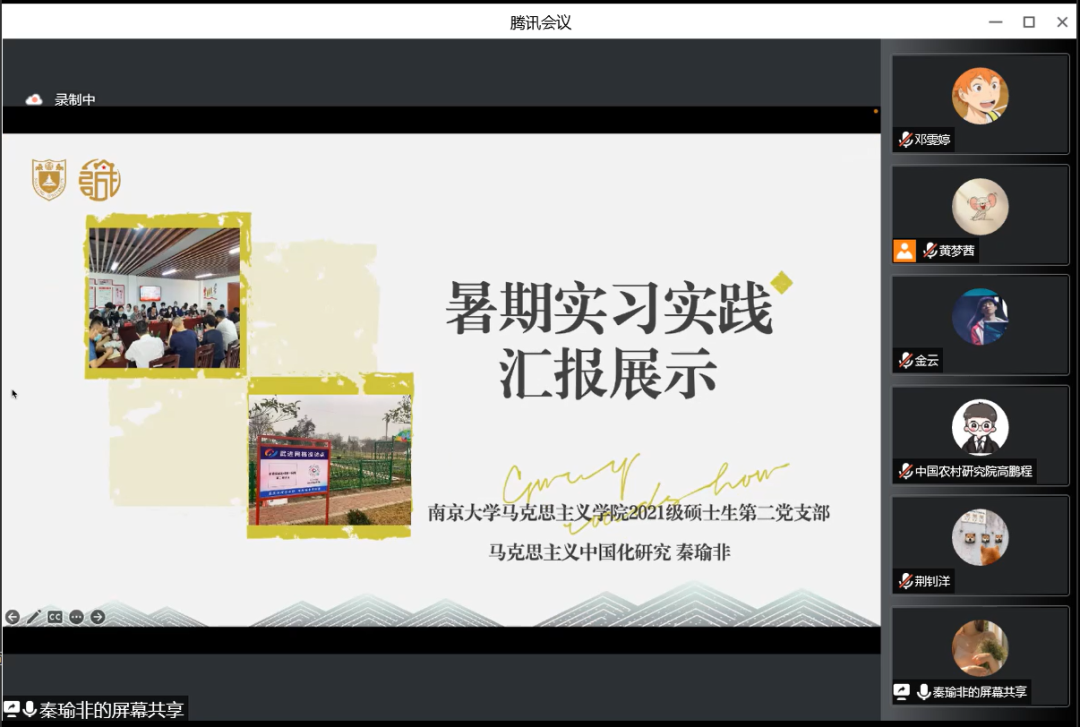 习近平总书记曾指出“广大团员青年自觉担当重任,深入基层一线,让青春在实现中华民族伟大复兴的中国梦中绽放异彩,为党和国家事业取得历史性成就、发生历史性变革贡献了青春、建立了重要功勋!”为深入学习习近平总书记关于青年工作重要指示精神,引领青年党员把人生理想融入国家和民族的事业中,积极投身乡村振兴伟大实践,在基层一线建功立业,2022年8月22日晚,马克思主义学院2021级硕士生第二党支部与安徽省民政厅养老服务处、中国农村调查中心(CRRC)联合开展“扬实践风采,展青年担当——2021级硕士研究生第二党支部暑期主题党日活动第3期‘乡村振兴’实践风采展示。”会议由2021级硕士生第二党支部成员荆钊洋同志主持。