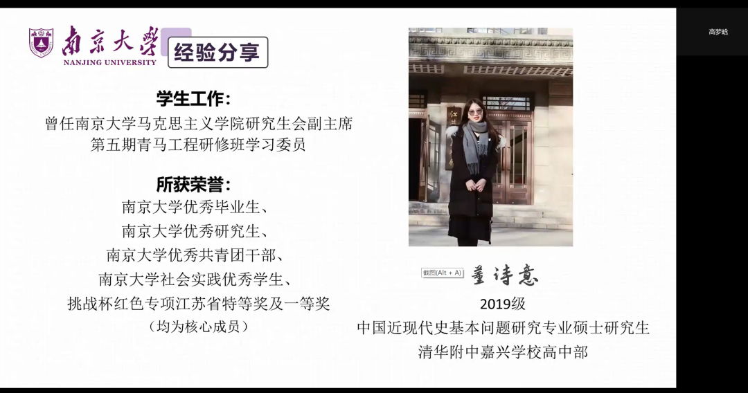 为帮助有志于从事教育工作的马院学子深入了解中学教师的职业特性,拓展选择视野与择业认知,明晰中学教师的准入条件与备考方向,2022年4月28日晚19点,马克思主义学院毕业生求职经验分享会之中学教师专场以在线会议的形式顺利举办。此次分享会共吸引来自各院系的50余名同学相聚云端,倾听学姐们选择中学教师职业的心路历程与经验分享。