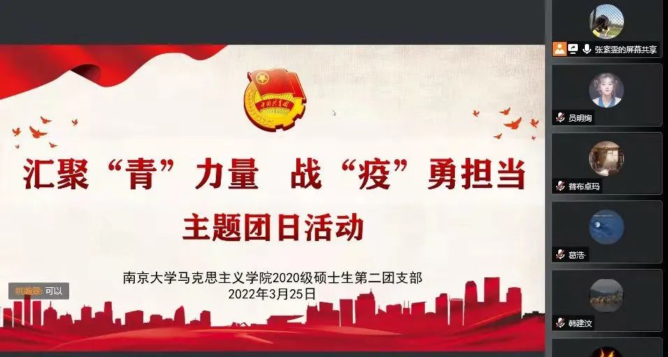 马克思主义学院2021级硕士生第二团支部、2020级硕士生第二团支部、2019级硕士生第二团支部以及2021级博士生团支部于线上联合开展了“薪火相传,弦歌不辍——南大精神大讨论”主题团日活动,百余名团员青年共聚云端、共话校庆、共学南大精神。