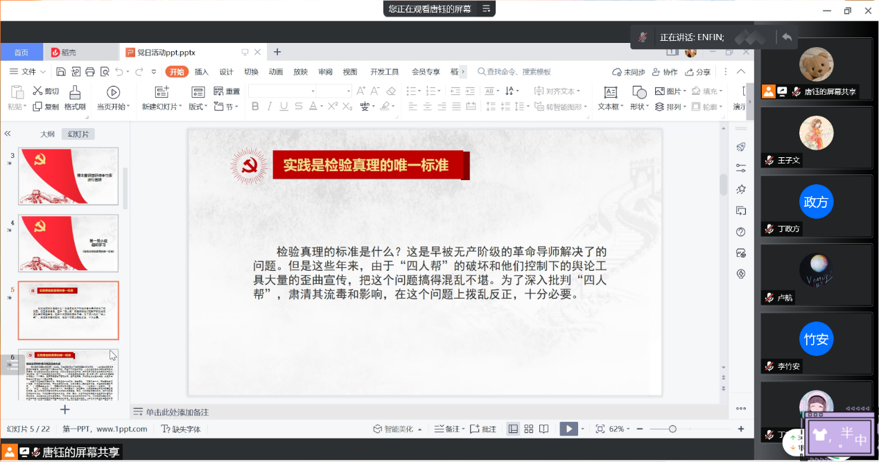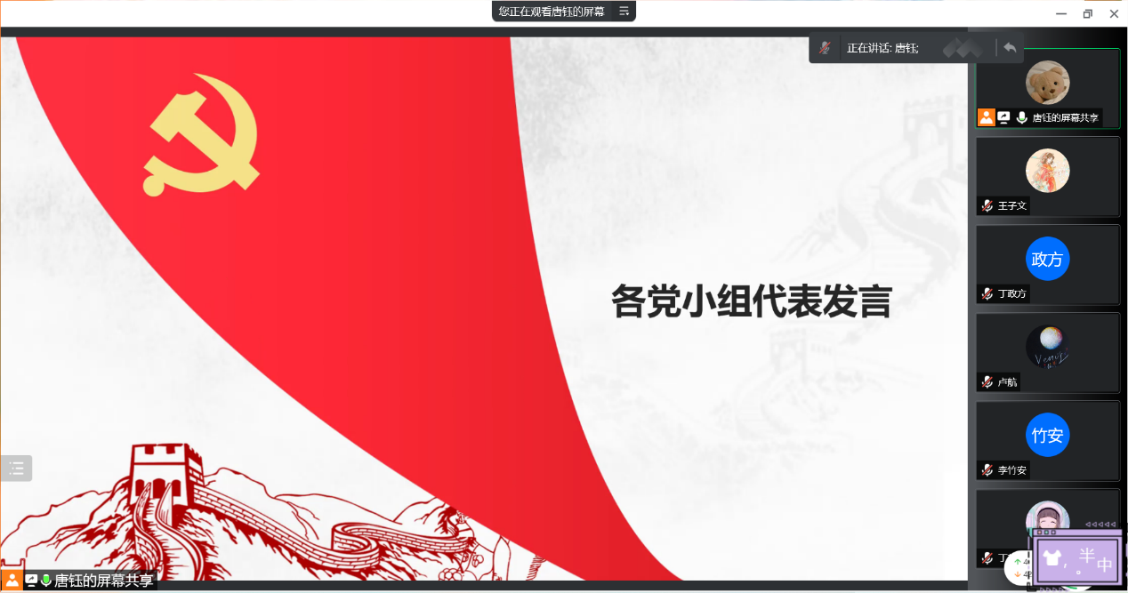 弘扬科学家精神,奋进强国新征程。2022年3月30日,为迎接党的二十大召开,在南京大学建校120周年校庆之际,马克思主义学院21级硕士研究生第一党支部邀请博士生讲师团讲师李竹安共同开设“党史校史小课堂”,学习科学家精神,迎接百廿校庆,跟随南京大学胡福明教授的脚步,围绕“关于真理标准问题大讨论”开展线上党日活动,活动由马克思主义学院2021级硕士生第一党支部书记唐钰同志主持。活动主要分为四个环节,分别为博士生讲师团党课宣讲、第一党小组组织学习、各党小组学习讨论和视频展示。